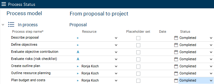 You can select a status from the listbox for each process step.