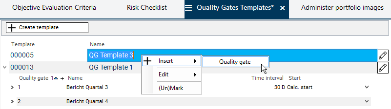 Right-click on the template record and select Insert → Quality gate in the context menu to create the new quality gate record.
