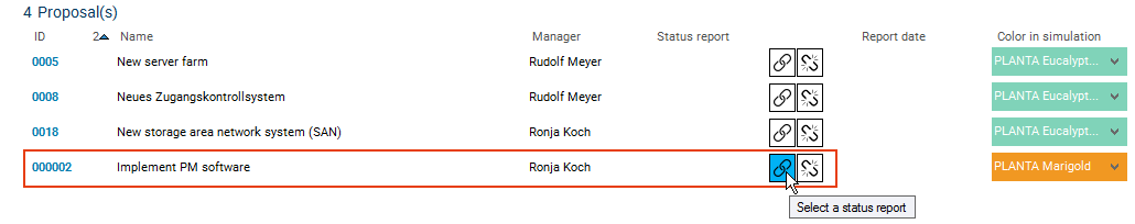 She clicks on the Select a status report button in the Status report selection area in the line of the Implement PM software proposal.