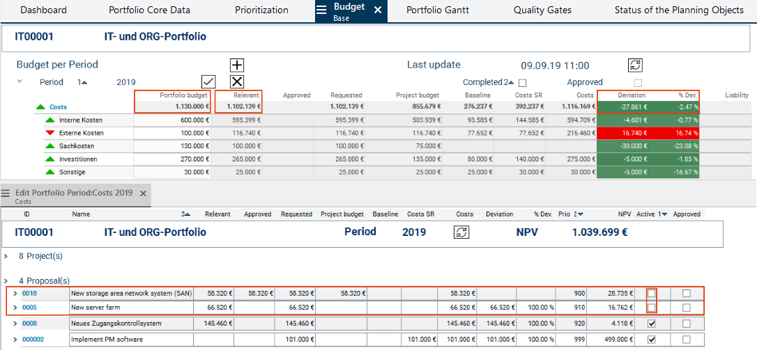 In the Proposal area, she deactivates the Active checkbox of proposals 0005 and 0018. As a result, the budget reserved for these proposals is no longer considered in the portfolio, i.e. the Relevant budget is reduced.