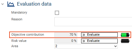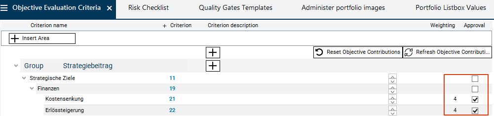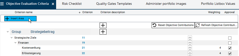 In this module, areas and groups are only selected in order to be used to outline objective evaluation criteria. The areas are created in the Portfolio Listbox Values module.