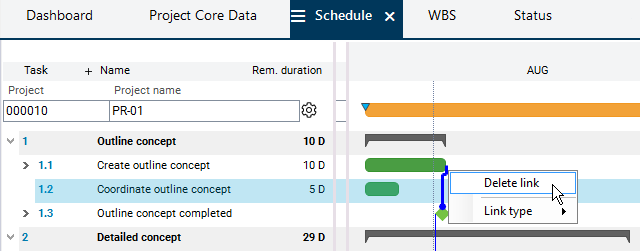 There can be multiple links between two tasks. In the calculation of the schedule, the most unfavorable relationship takes effect, i.e. the link that causes the latest start date.