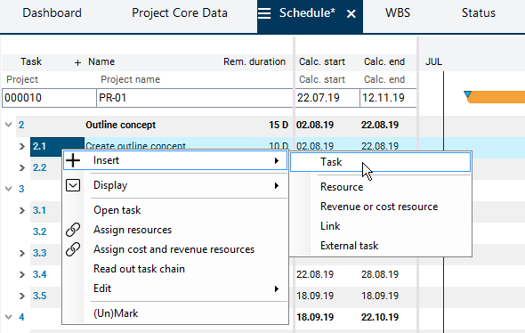 In the Schedule module, right-click on the Create outline concept task and select Insert → Task from the context menu.
