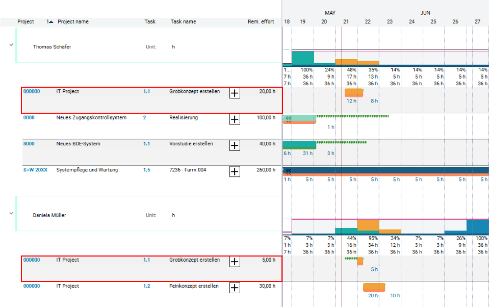 Calculate schedule button in the toolbar.Result: The dates are calculated, the planned effort is distributed over the planned duration and existing overloads are identified.
