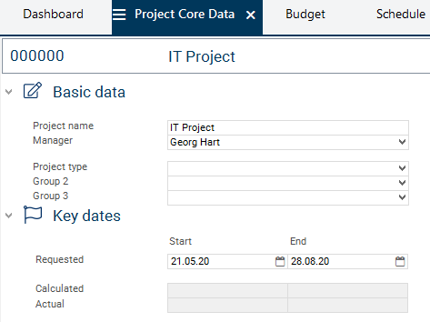 Georg Hart is automatically entered as manager in the Manager field. Do not change the entry, for he is to be the responsible project manager of the new project.