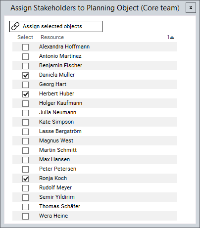 Select the required stakeholders (image below) by activating the respective checkboxes and click on the Assign selected objects button.