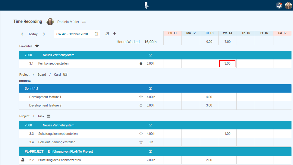 Switch back to Daniela Mueller’s Time Recording in the PLANTA pulse system.