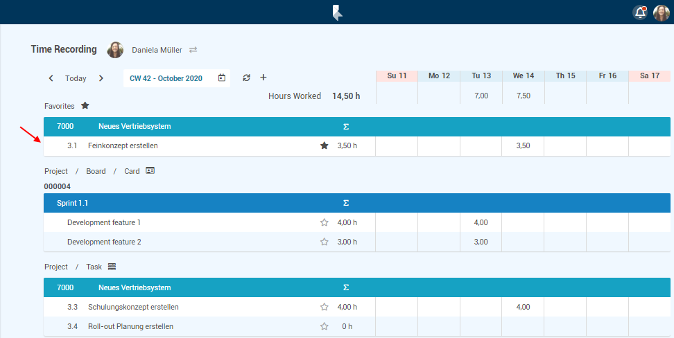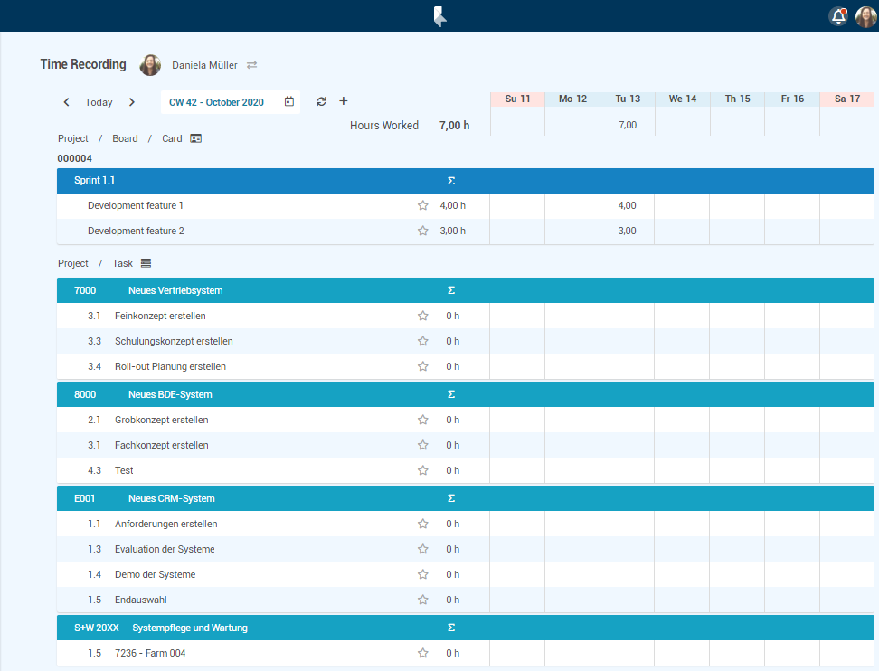 Today, Daniela Mueller has worked on the 3.1 Feinkonzept erstellen ("Create detailed concept") and 3.3 Schulungskonzept erstellen ("Create training concept") tasks of project "7000" for 3,5 and 4 hours respectively.