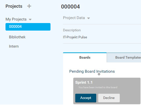 The next time Thomas Schaefer opens PLANTA pulse, he sees the board of Sprint 1.1 to which he was invited in the Boards tab of the IT Project Pulse project.