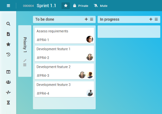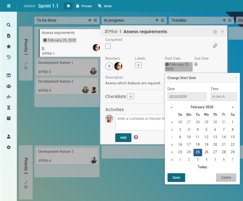 Georg Hart decides that feature 3 in the Sprint 1.1 project task has a low priority. In order to have this represented in the board, he moves the Development feature 3 card to the Priority 2 swimlane.