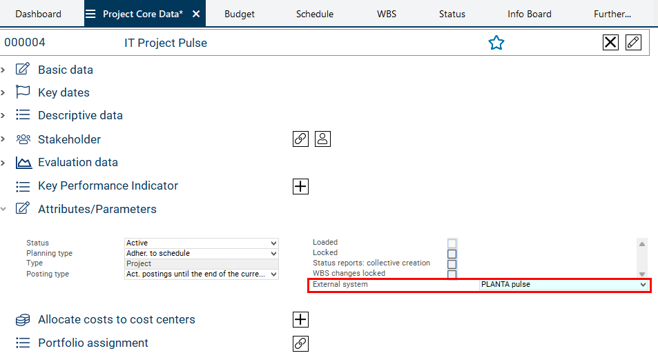 Select the PLANTA pulse entry from the External system listbox in the Project Core Data module in the Attributes/Parameters area.