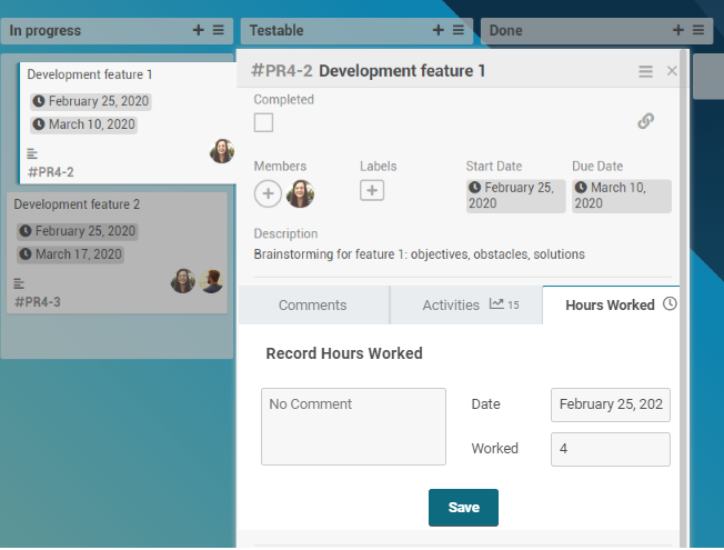 Board members can record hours worked directly on the corresponding cards.