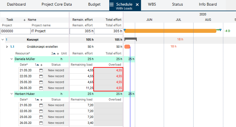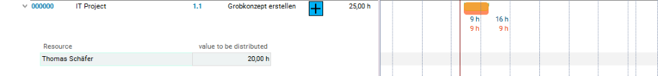 Calculate schedule button in the toolbar.Result: The dates are calculated, the planned effort is distributed over the planned duration and existing overloads are identified.