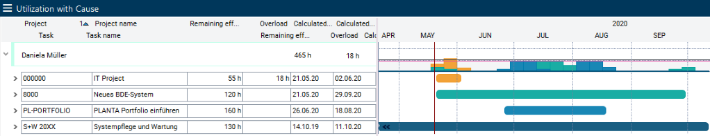 He sees that Daniela Mueller is currently planned in four projects and that the new project in May causes an overload.