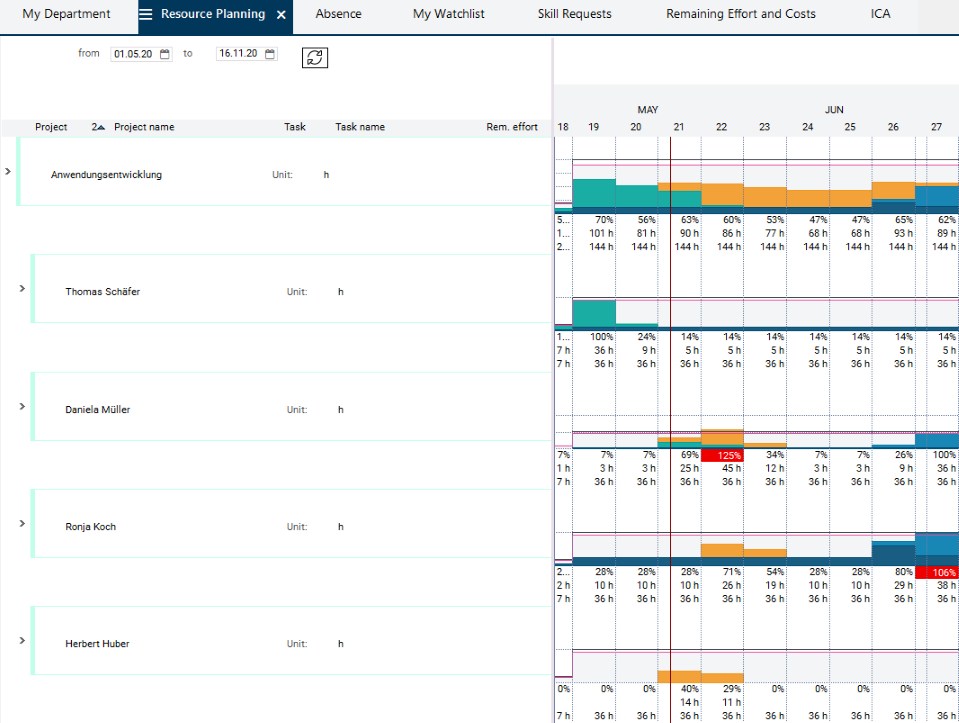 The manager of the Application development department (Thomas Schaefer) wants to check whether he can reduce the overload of Daniela Mueller by assigning work loads to other employees.