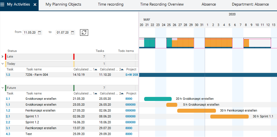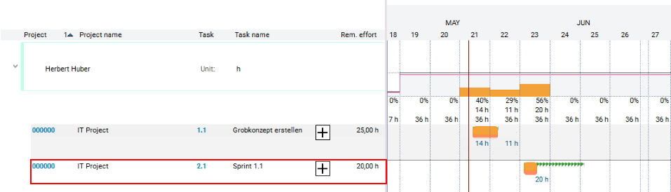 • Result: The dates are calculated, the planned effort is distributed over the planned duration and existing overloads are identified.
