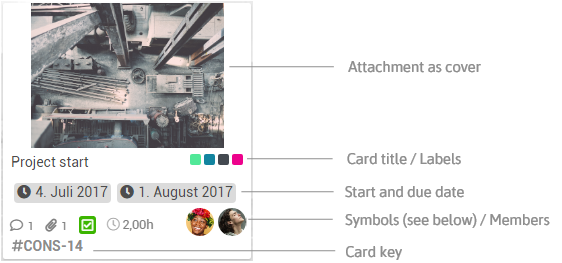 - On boards, cards are displayed as preview with their most important details and can be sorted using Lists and Swimlanes.