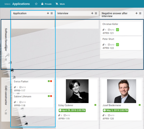 - Lists and swimlanes can be rearranged within a board using Drag&Drop.