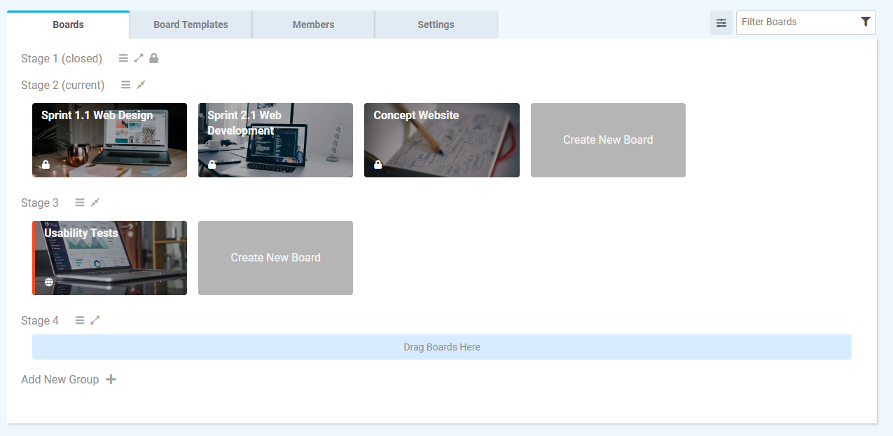 - If needed, new board groups can be created to sort the boards (e.g. by project stages or departments).