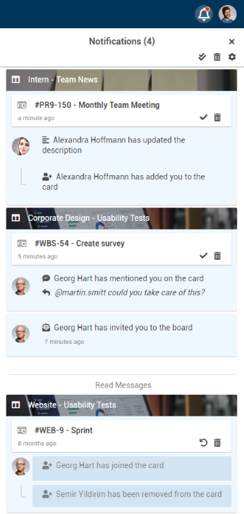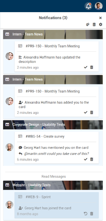 For every notification, the symbols are displayed, which can be used to mark notifications as read or to delete them.