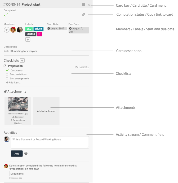 - On boards, cards are displayed as preview with their most important details and can be sorted using Lists and Swimlanes.