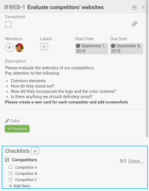 - Since the card "Evaluate competitors' websites" has a due date, she decides to start with this task.