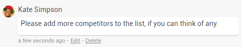 - Kate Simpson isn’t sure whether she thought of all the competitors. She wants to ask the team to add more competitors to the checklist, if needed.