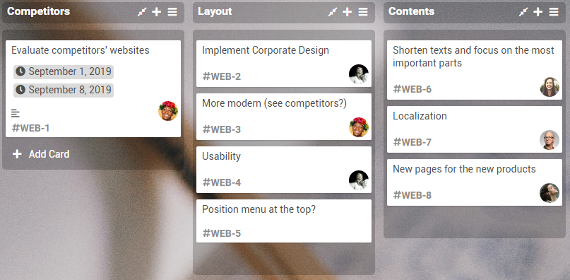- So far, only a few cards have been added to the board. Because of the avatars, Kate Simpson can therefore see quite quickly which cards she has been assigned to.
