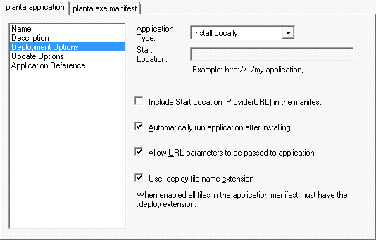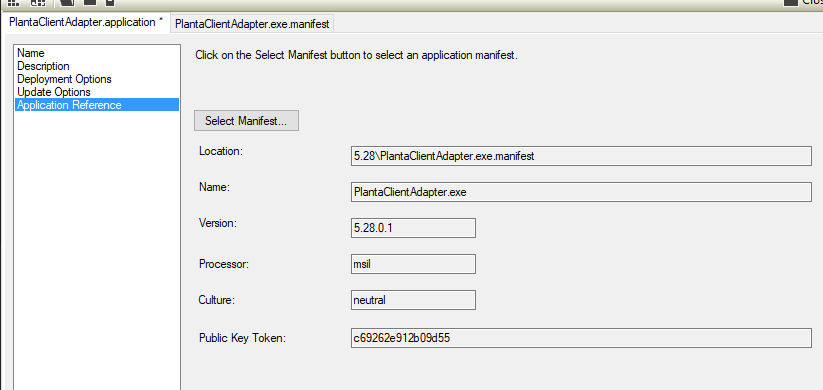 Select File → New → Deployment Manifest or open the already existing planta.application manifest via File → Open.