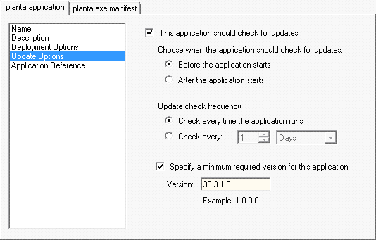 Select the This application should check for updates as well as the Specify a minimum required version for this application checkboxes in the Update options tab.